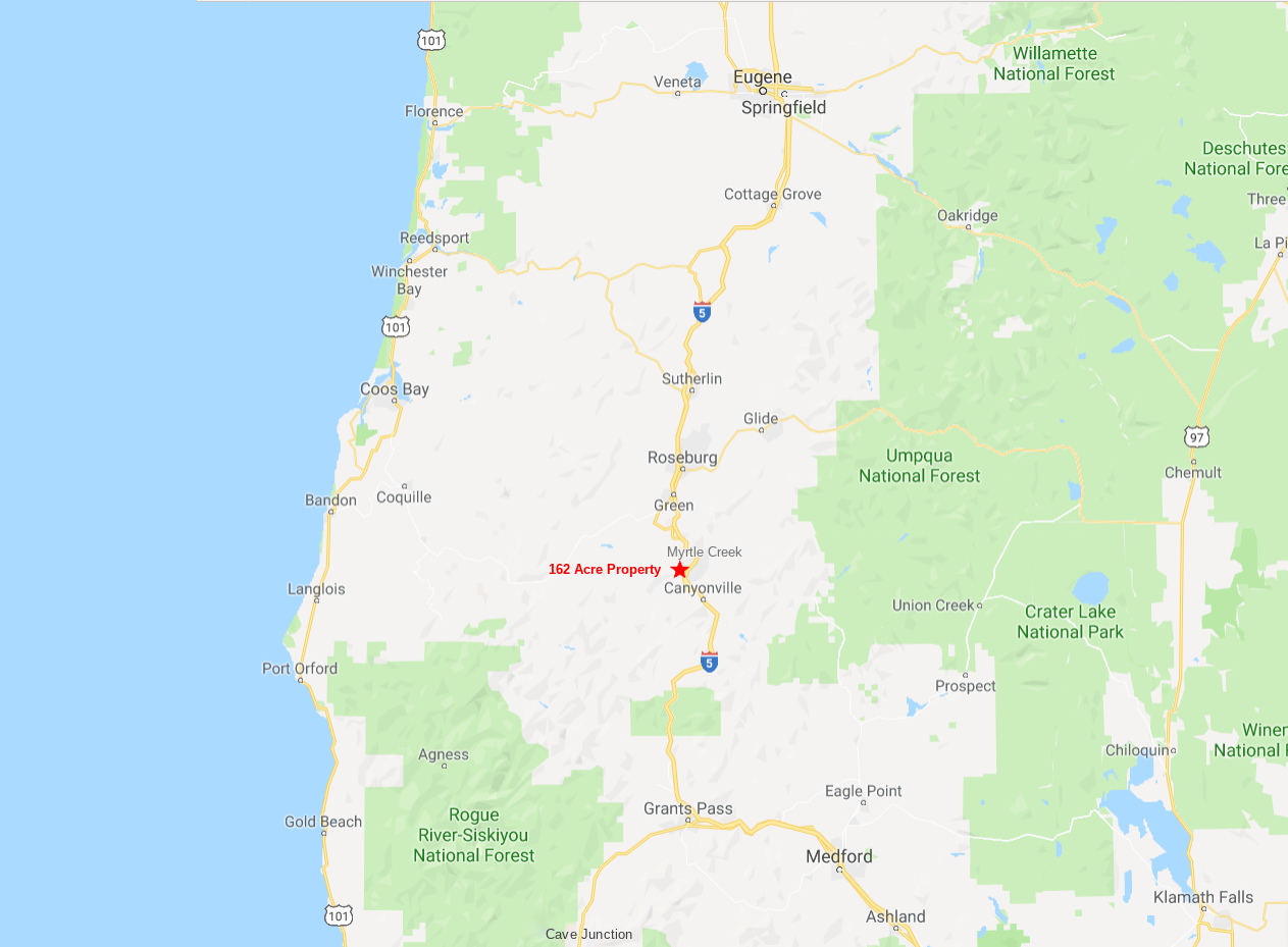 One hundred and sixty-two acres located in Douglas county, south-western Oregon. Situated in the Coast Range mountains, overlooking the Umpqua river valley. The rugged topography includes ridges, canyons, rock outcroppings, meadows, creeks, springs and a variety of trees, plants and wildlife.